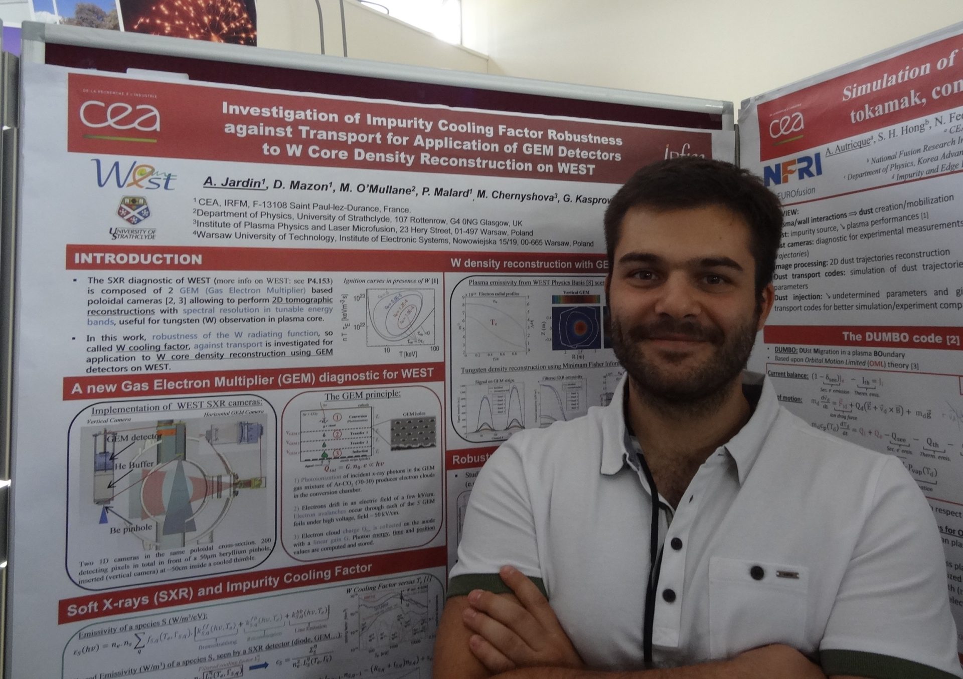 Axel Jardin, en 3ème année de thèse à l’IRFM, a gagné l’un des quatre prix qui récompensent les meilleurs posters présentés par des étudiants en thèse lors de la conférence EPS 2017. 70 posters de thésards ont été jugés par le Comité d’évaluation de la conférence EPS (European Physical Society) en physique des plasmas qui se tenait cette année à Belfast (Irlande du Nord) du 26 au 30 juin 2017. Elle réunit tous les ans plus de 500 physiciens.
