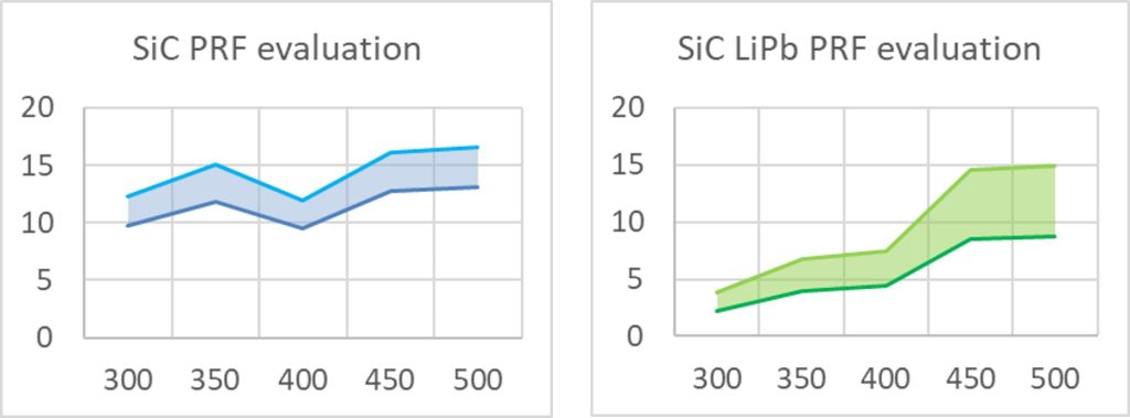 Cette activité a consisté dans un premier temps à élaborer et à tester, sur la boucle « Corrosion Loop for Liquid Metal Experiments (CICLO) » du CIEMAT [5], la performance en termes de barrière anticorrosion de différents revêtements comme l’alumine (Al2O3) ou le carbure de silicium (SiC). Le revêtement en SiC s’est révélé le plus performant en protégeant efficacement l’Eurofer après une exposition de 1500h à du LiPb à 450°C. Dans un second temps, l’impact des barrières anticorrosion sur la perméation a été étudiée. Cet impact peut être évalué en déterminant le rapport, appelé facteur de réduction de la perméation (Permeation Reduction Factor, PRF), entre la perméation du matériau sans et avec la barrière anticorrosion. Un PRF élevé indique une forte capacité à bloquer la perméation. Après extraction et élimination des résidus de LiPb, la perméation en deutérium de 100 à 550°C a été évaluée sur le banc Hypertomate* du CEA-IRFM [6]. Les résultats mettent en avant qu’en terme de perméabilité, l’Eurofer exposé au LiPb est identique à l’Eurofer nu (la couche de corrosion n’a pas d’influence sur la perméation, son PRF est égal à l’unité). En revanche, la barrière anticorrosion en SiC impacte la perméation. Des mesures de PRF montrent des valeurs comprises en 10 et 16 sur des échantillons d’Eurofer avec revêtement SiC non exposé au LiPb et des PRF entre 2 et 10 après exposition au LiPb pendant 1000h (figure ci-dessous). Ces résultats indiquent une baisse de l’efficacité de ces barrières anticorrosion en termes de perméation lors d’une l’exposition au LiPb notamment à des températures inférieures à 400°C. Ces résultats soulignent le potentiel du SiC comme barrière anticorrosion et anti-perméation, mais aussi les limites face à une exposition prolongée au LiPb. Ils seront complétés par des expériences en tritium qui ont démarrées au laboratoire tritium du CEA-Joliot.
