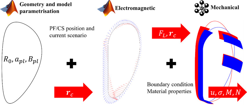 CIRCE rassemble plusieurs modules (géométrique, électromagnétique et mécanique) et propose une séquence complète de calcul pour évaluer la performance des structures (figure 1). Les modèles éléments finis sont basés sur des formulations d’ordre réduit 1D et 2D qui diminuent grandement le nombre total de points de calcul et fournissent des résultats en quelques secondes. Cette approche a été validée [1] avec des modélisations effectuées sur des machines en opération ou en construction telles que ITER ou WEST. L’outil étant paramétrique et flexible, des études sur le concept de Stellarator ont été menées en complément de la configuration Tokamak ([2] et figure 2).