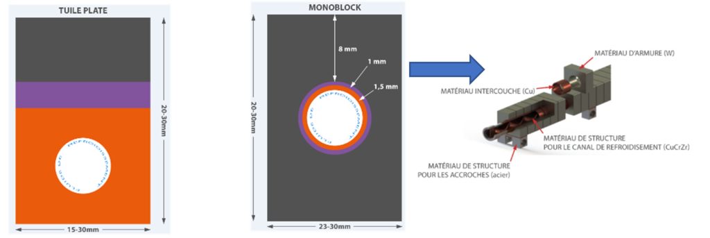 Actuellement, les composants des divertors des tokamaks activement refroidis, WEST (France), KSTAR (Corée) et EAST (Chine), peuvent résister à des flux de chaleur de 10 MW/m² en régime stationnaire et 20 MW/m² pendant des excursions transitoires. Ces composants sont basés sur l’utilisation de tungstène face au plasma, sous forme de monobloc ou de tuile, assemblés sur un dissipateur thermique en alliage de cuivre (CuCrZr) dans lequel un canal de refroidissement est inséré (Figure 1). Le CuCrZr est choisi pour sa haute conductivité thermique et ses bonnes propriétés mécaniques [1]. Les méthodes de fabrication conventionnelles sont généralement utilisées, comme par exemple l’usinage de CuCrZr forgé. Cependant, cette approche présente des restrictions géométriques liées à l’usinage. La fabrication additive offre une alternative intéressante, permettant de réaliser en une seule étape la pièce complète, avec une plus grande liberté sur la forme des canaux de refroidissement.