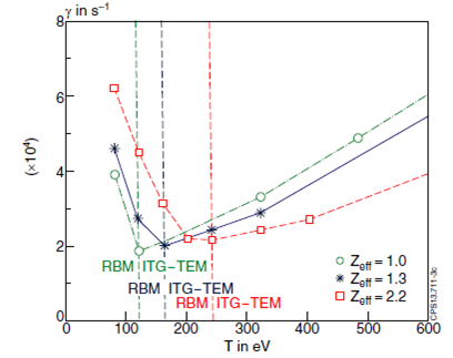The nature of the primary instability present in the region of the plasma where the confinement is enhanced (pedestal region) prior to the L-H transition is analyzed using a so-called gyro-kinetic code on JET-ILW using temperature and density profile measurements. The linear analysis shows that the primary instability is of resistive nature and can be stabilized when the temperature is increased, hence when the power is increased. The unstable modes are identified as being Resistive Ballooning Modes (RBM). Their growth rates decrease for temperatures increasing towards the experimentally measured temperature at the L-H transition. As the temperature raises further Ion temperature Gradient (ITG) and Trapped Electron Modes (TEM) are destabilized. The low temperature RBM have lower growth rates for lower effective charge Zeff as illustrated by the figure below. This dependence is shown to be in qualitative agreement with recent and past experimental observations of reduced Zeff associated with lower L-H power thresholds.